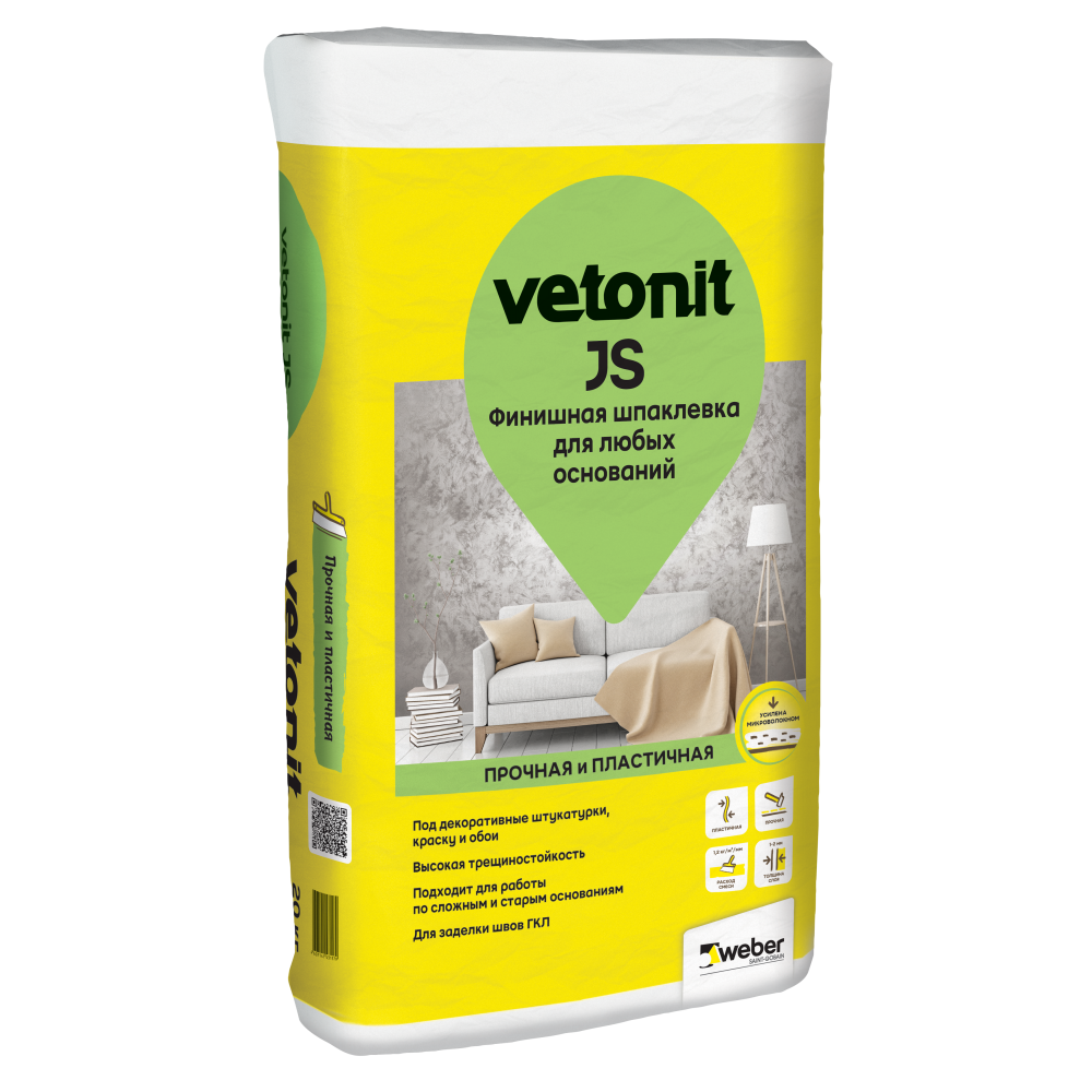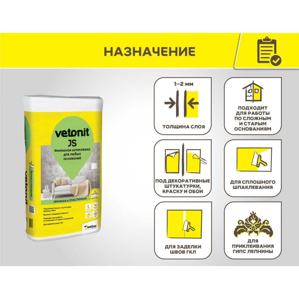 Vetonit JS может применяться как для сплошного шпаклевания , так и для специализированных задач, таких как подготовка поверхностей под декоративные штукатурки, заделка швов ГКЛ, работа со сложными основаниями и приклеивание гипсовой лепнины. Наличие микроволокна в составе делает поверхность особенно прочной, что особенно важно для долговечности и качества отделки.