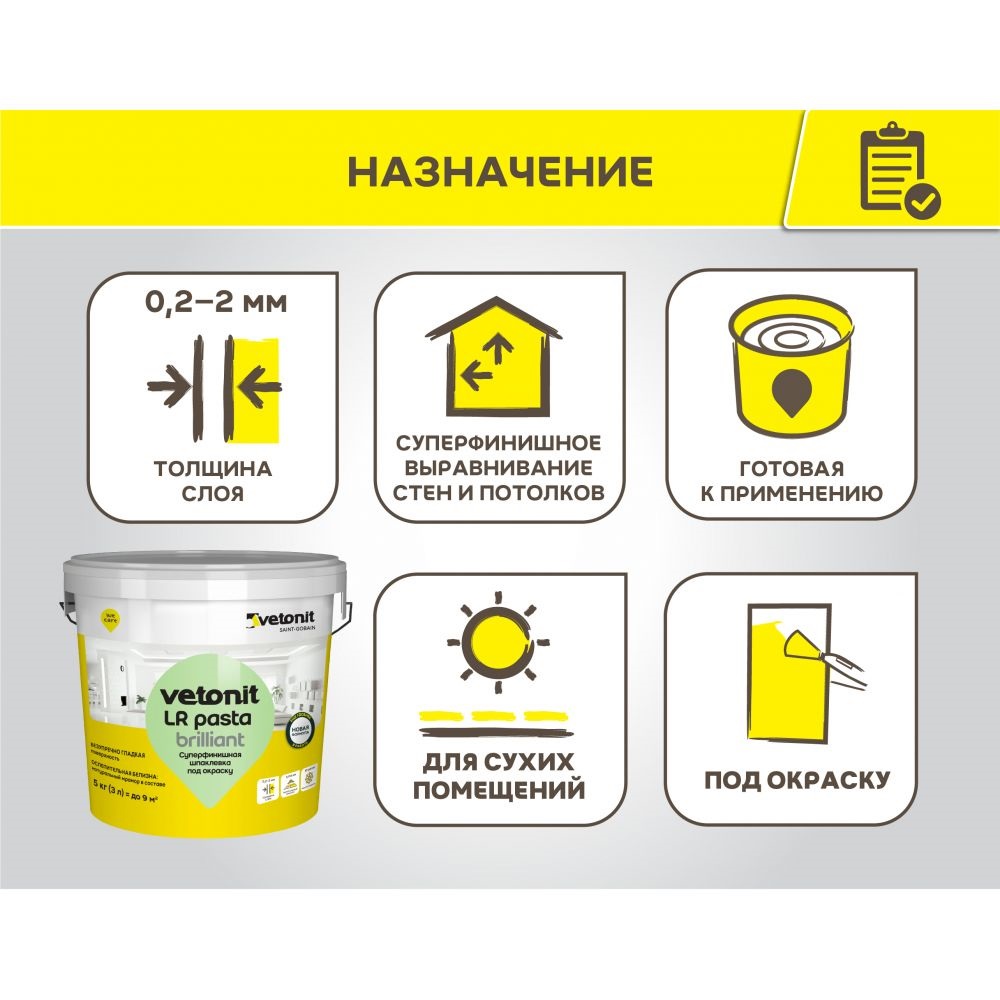 - Шпаклевка vetonit LR Pasta brilliant не является водостойкой и она непригодна для выравнивания полов или оснований под облицовку плиткой.