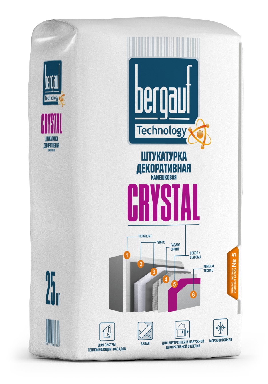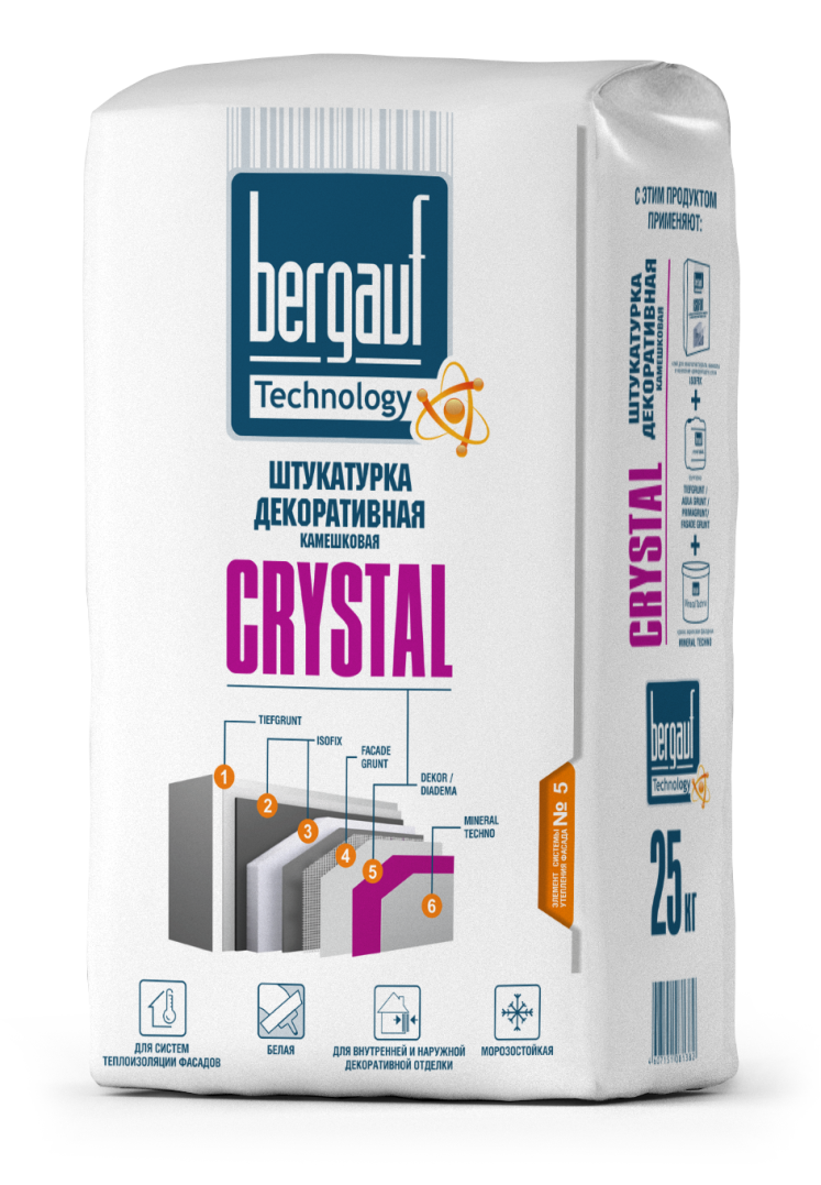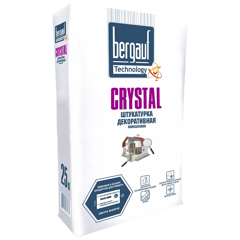 Штукатурка декоративная Bergauf Crystal "камешковая" 1-1,5мм 25 кг - декоративная белая штукатурка на цементной основе, морозостойкая. Применяется для создания декоративно-минерального окрашенного слоя в системах СФТК, а также для декорирования оштукатуренных фасадов и внутренних помещений. Ручное нанесение. Применима для следующих оснований: бетон, железобетон, ячеистый бетон, цементная, цементно-известковая штукатурка, гипсокартон.