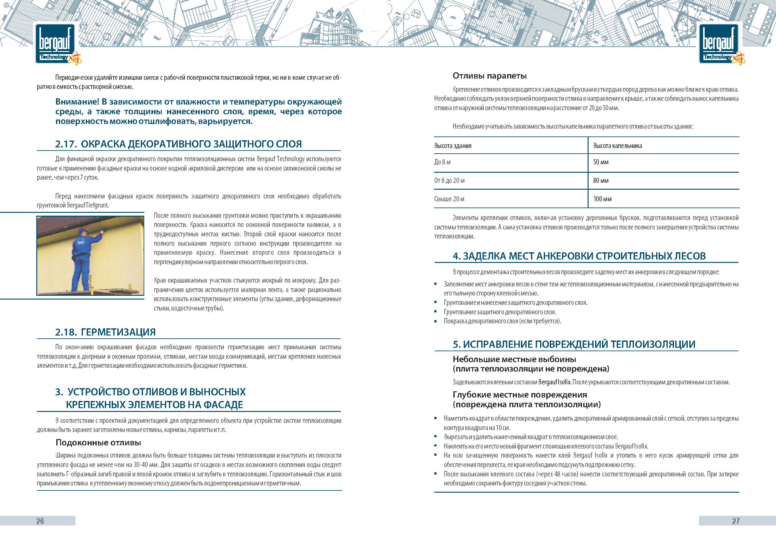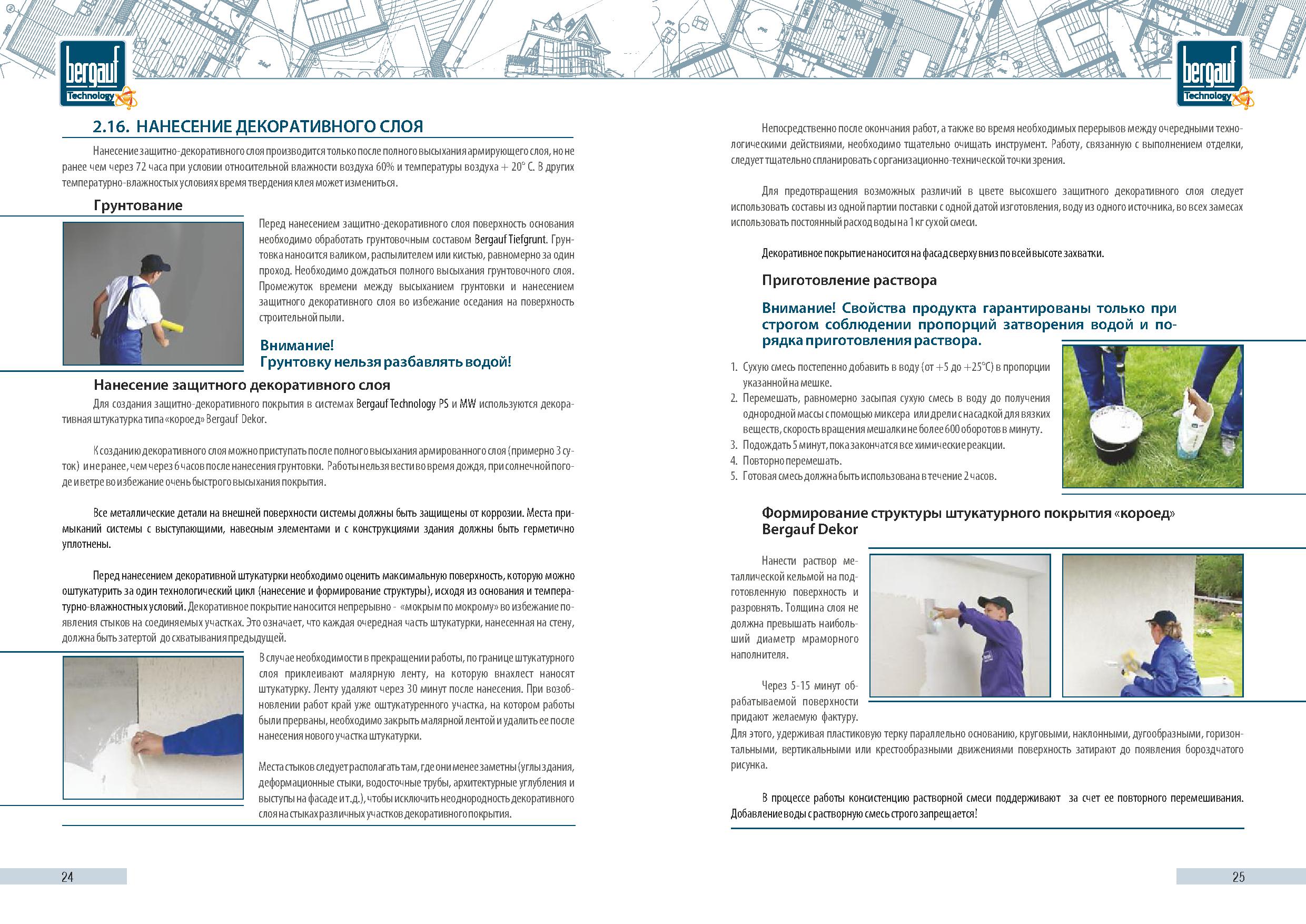 При температуре основания не менее +5? для достижения максимального эффекта рекомендуется обработать основание грунтовкой Bergauf Fa?ade Grunt, сухие и сильно впитывающие основания, например ячеистый блок, необходимо прогрунтовать 2 раза Bergauf TIEFGRUNT или Bergauf AQUAGRUNT.