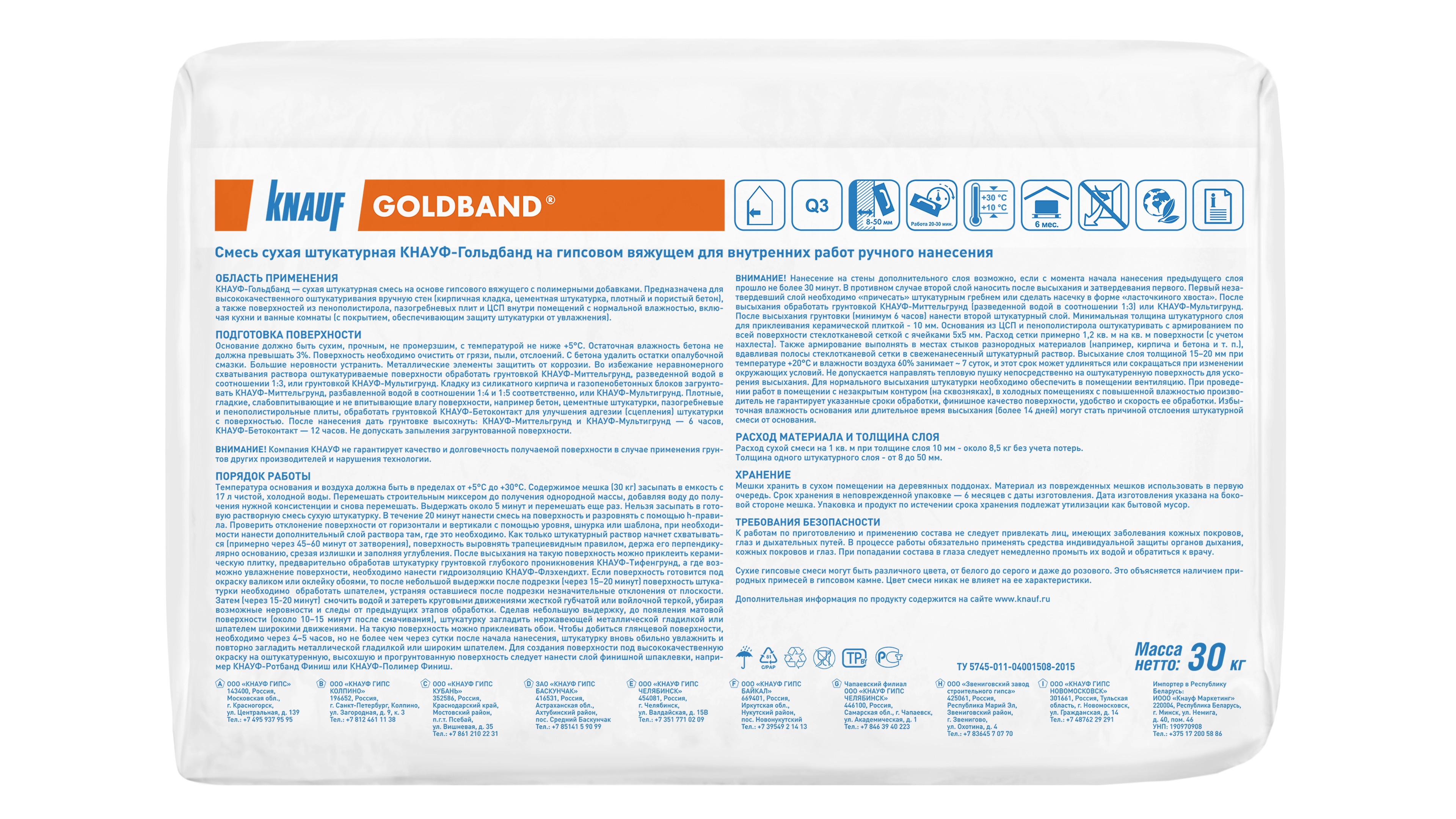 Штукатурка КНАУФ-Гольдбанд гипсовая для стен 30кг - сухая штукатурная смесь на основе гипсового вяжущего со специальными добавками.