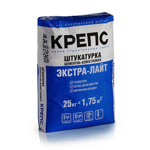 КРЕПС Экстра-лайт – сухая строительная цементно-известковая смесь, состоящая из мелкозернистого фракционированного песка и специальных добавок. При смешивании с водой образует пластичную растворную смесь, которая легко наносится на основания. Рекомендуется для машинного и ручного нанесения. После затвердевания образует водостойкий и морозостойкий раствор. КРЕПС Экстра-лайт предназначен для выравнивания стен и потолков из бетона, железобетона, кирпича, газобетона при внутренних и наружных работах. Используется вкачестве накрывочного слоя по грубым цементным штукатуркам. Введение в раствор противоморозной добавки КРЕПС АНТИФРИЗ позволяет проводить работы при температуре до -10°С.