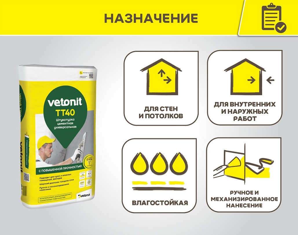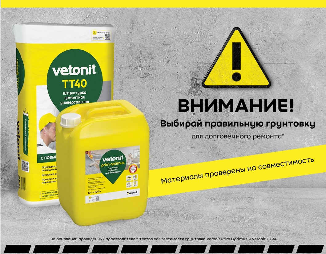 Для повышения износостойкости материала и улучшения адгезии с твердыми основами, 10% воды для смешивания рекомендуется заменить составом вебер.ветонит МД 16 (weber.vetonit MD16). Штукатурка weber.vetonit ТТ40 не пригодна для выравнивания полов и для нанесения на материалы на полимерном, органическом и гипсовом связующем, а также на слабые известковые штукатурки и окрашенные поверхности.