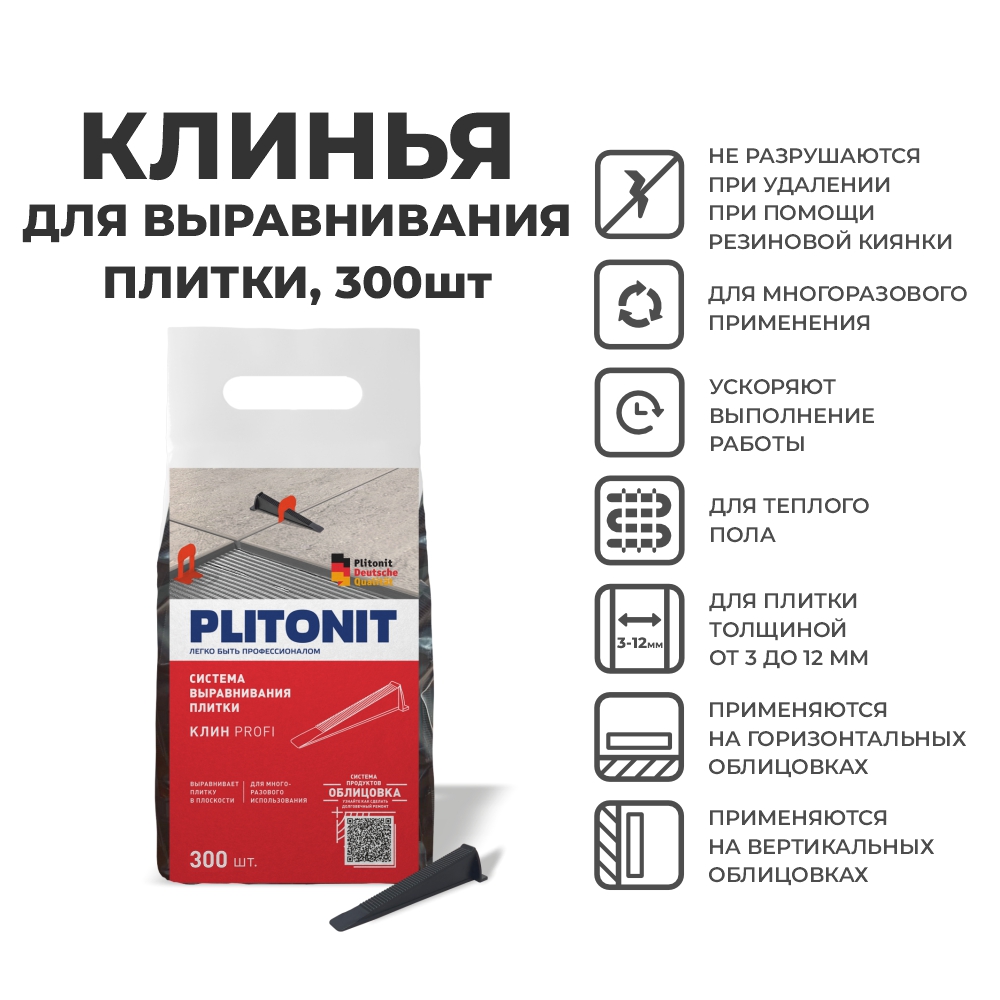 Преимущества СВП PLITONIT: Клин выполнен из высококачественного пластика и позволяет применять его многократно без деформации гребенки и ухудшения фиксирующих свойств, что дает мастеру экономичность в применении