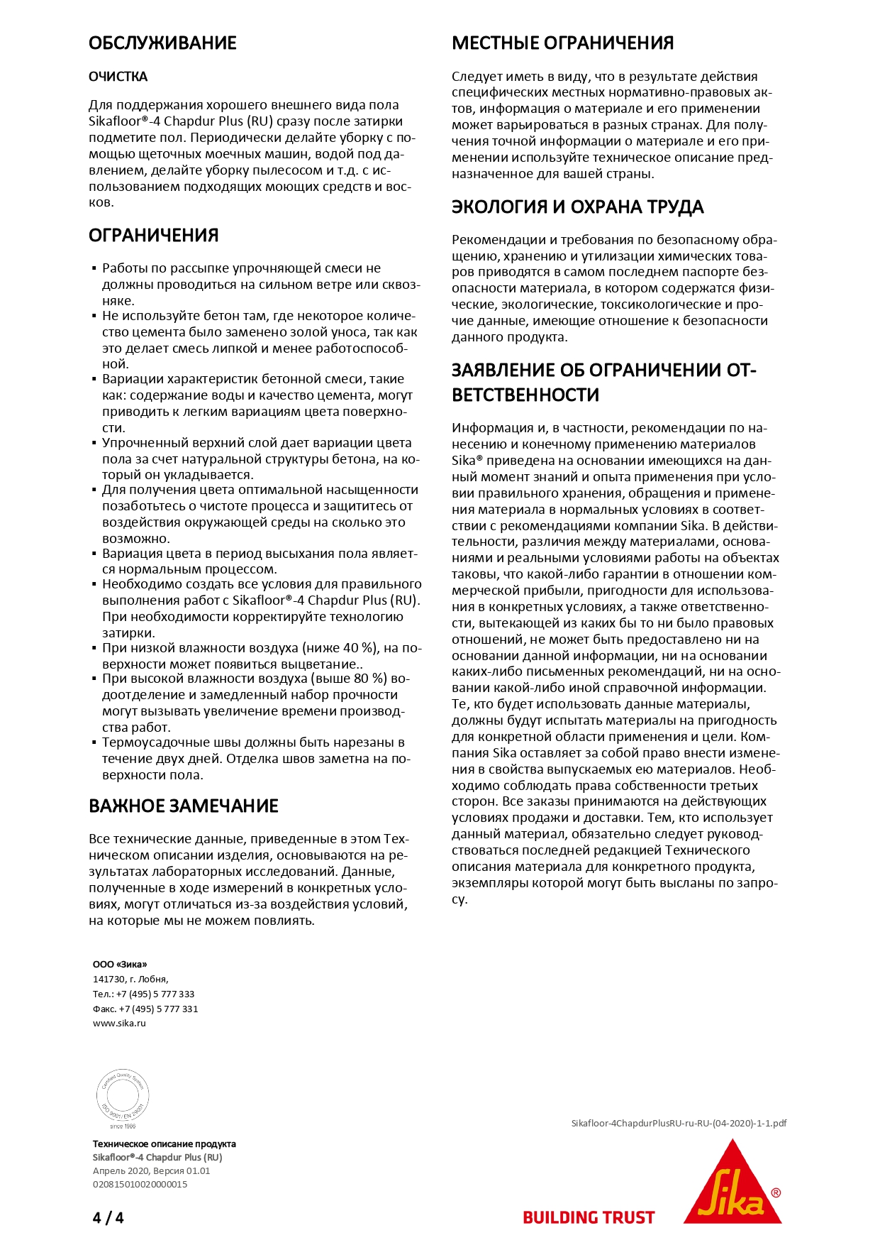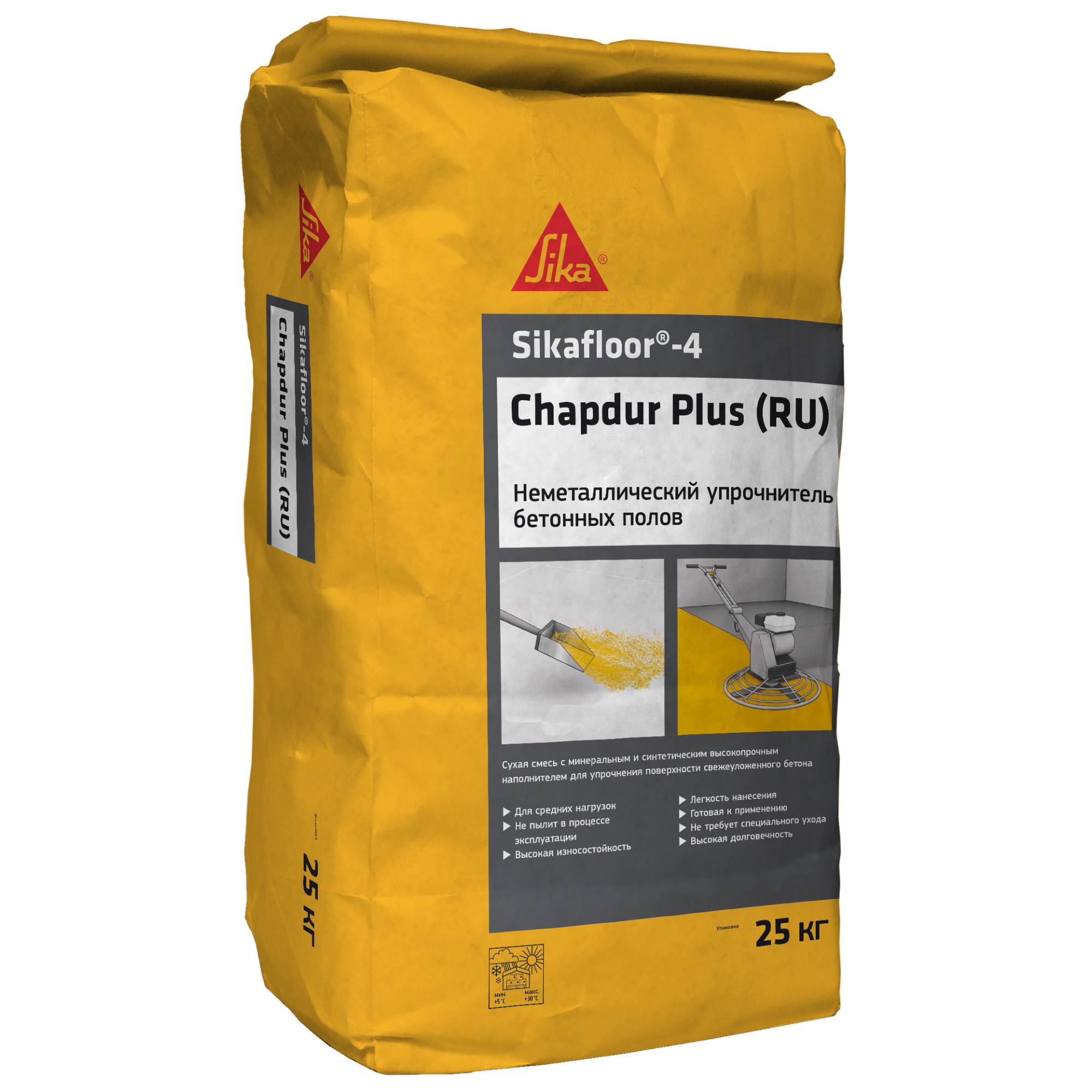 Sikafloor-4 Chapdur Plus - это однокомпонентная, готовая к применению смесь специальных цементов, твердых минеральных и синтетических наполнителей, близким по свойствам к корунду, совместимых химических добавок и пигментов для упрочнения бетонных полов.