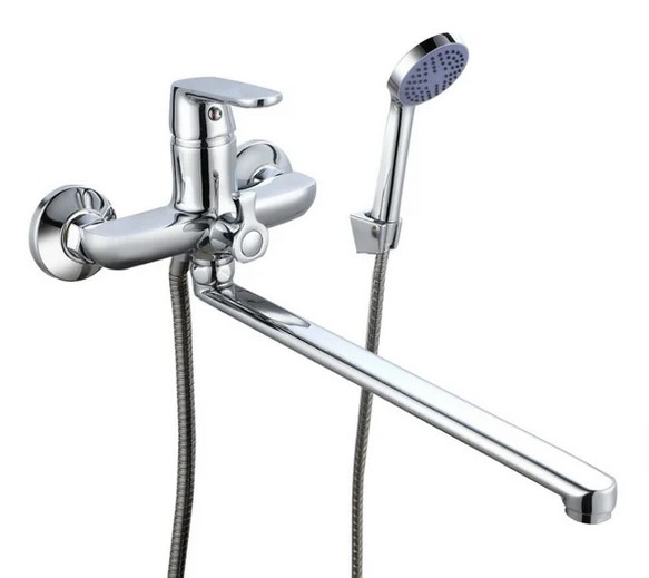Стильный и функциональный однорычажный смеситель для ванны и душа с длинным поворотным изливом удобен и надежен в использовании.