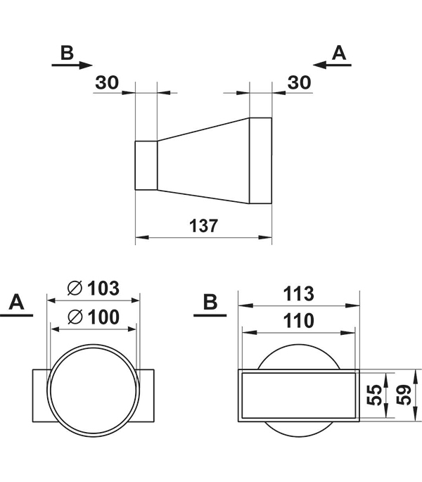 Соединитель вентиляционный плоского канала с круглым 55 х 110мм d100мм применяется для соединения плоских воздуховодов сечением 55х110мм с круглым диаметром 100мм.
