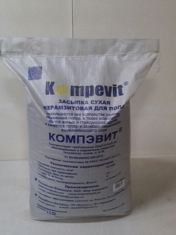 Сухая засыпка Компэвит - представляет собой отсев керамзита, сухой керамзитовый песок определенного фракционного состава (от 1 до 5 мм). Керамзит изготавливается из природного сырья и не содержит вредных для здоровья примесей. Он находит свое применение в работах по утеплению полов, потолка, кровли, перекрытий, и используется как шумо-изоляционный материал при различных ремонтно-строительных работах.
