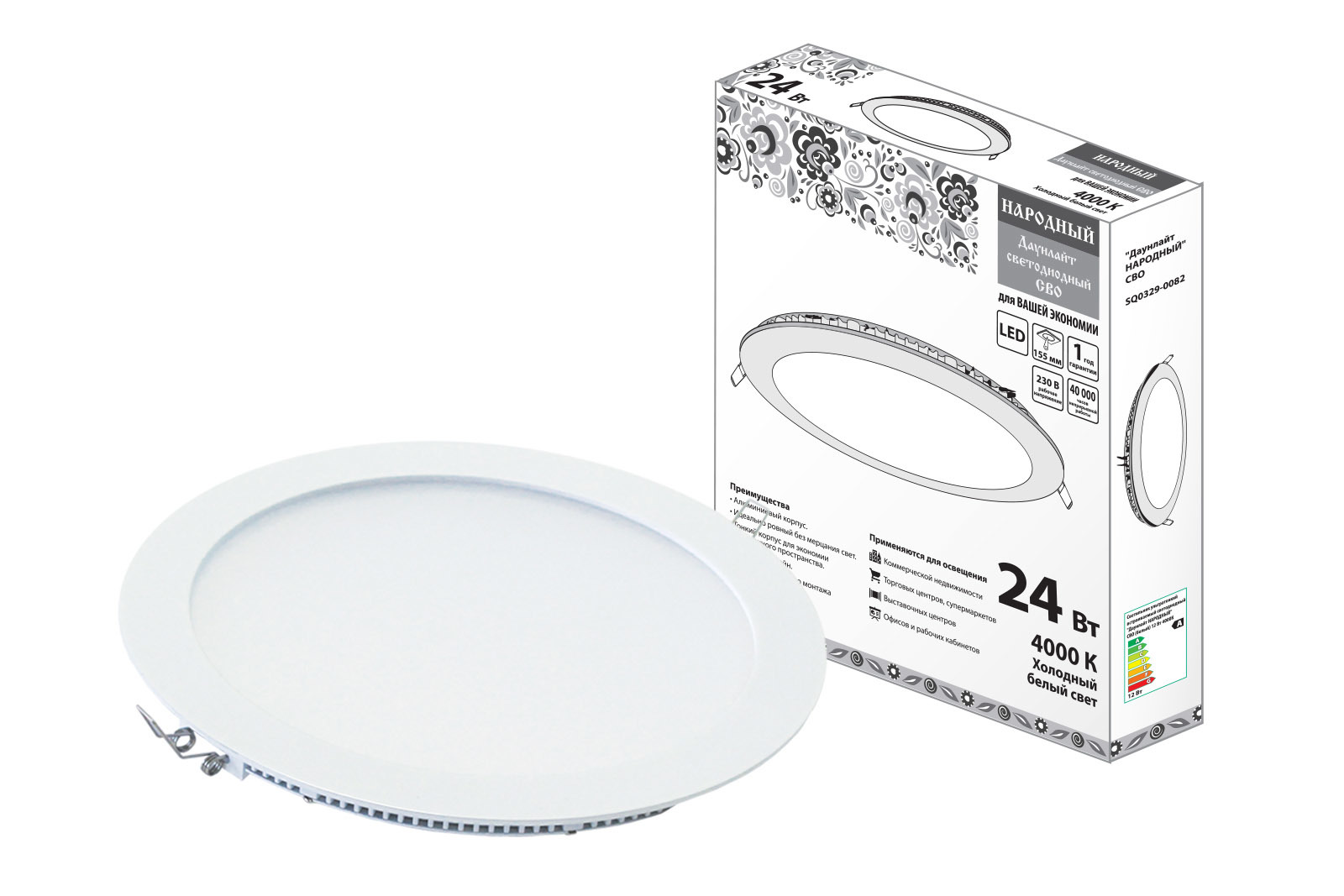 Светильник светодиодный встраиваемый тип "Даунлайт" круглый 230В 24Вт 6500К белый используется для точечного освещения помещения.