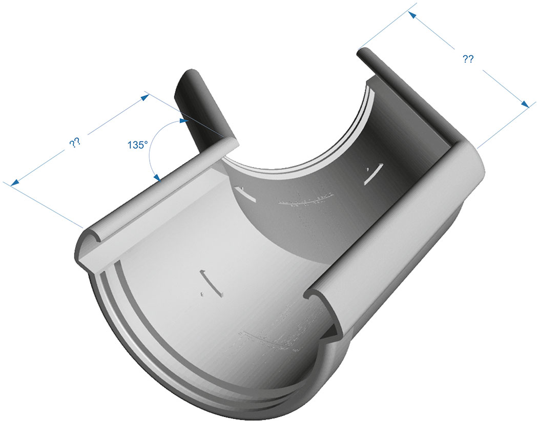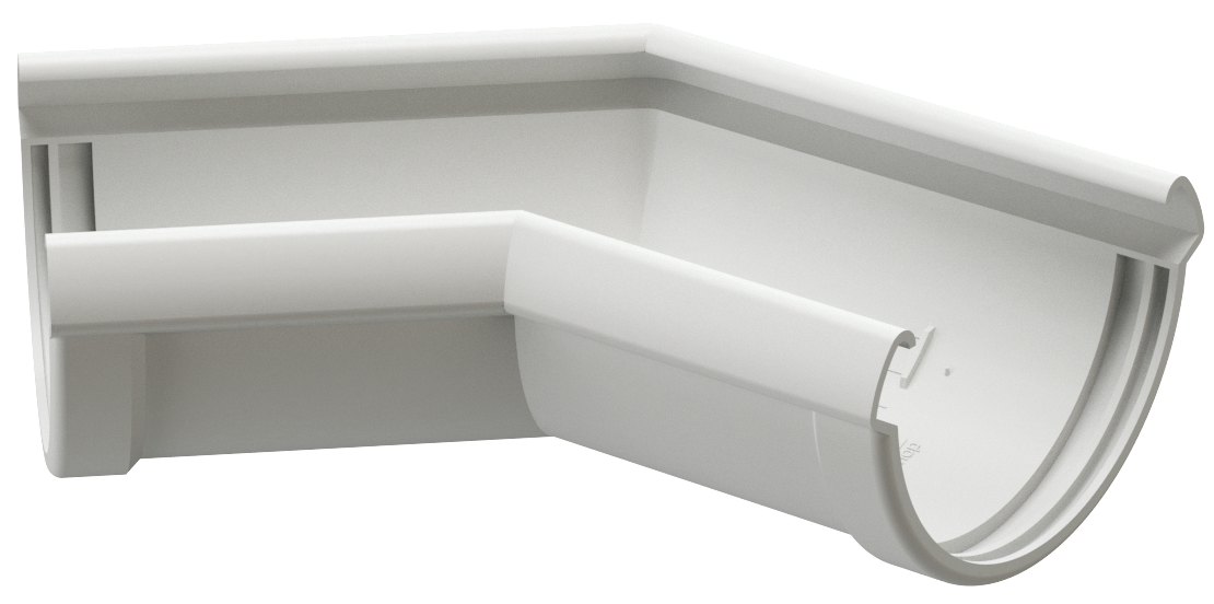 Угловой элемент желоба устанавливается на внутренних и внешних углах кровли и предназначен для соединения желобов под углом 135 градусов для изменения направления движения воды.