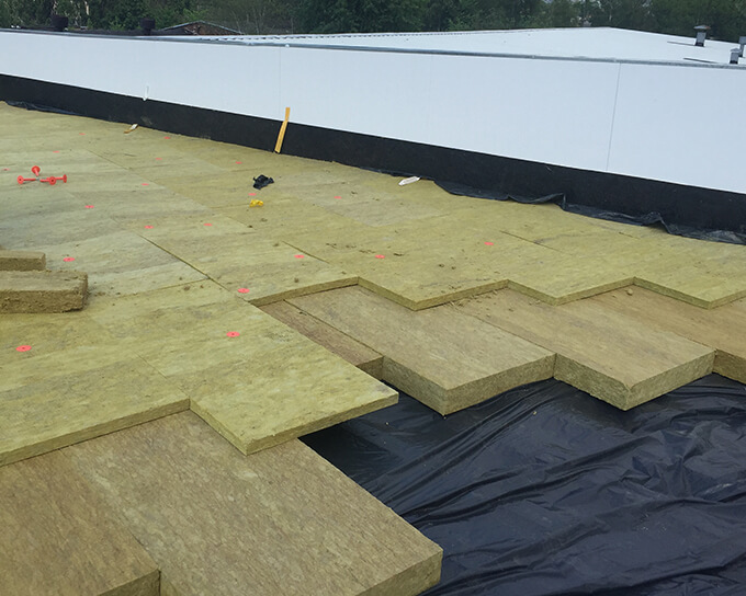 Применяется в качестве верхнего теплоизолирующего слоя в конструкциях двухслойного утепления плоских кровель.
