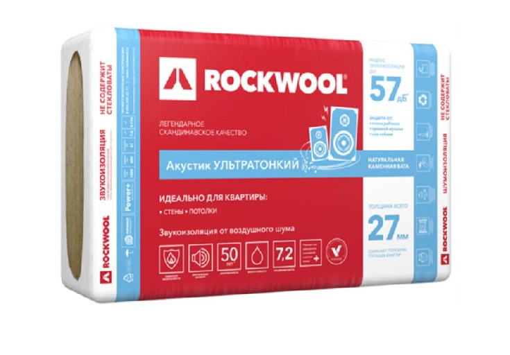 Плиты из каменной ваты ROCKWOOL Акустик УЛЬТРАТОНКИЙ* (АКУСТИК БАТТС ПРО) – это звукопоглощающий материал для дополнительной звукоизоляции существующих стен и потолка, который удобно использовать в конструкции, возводимой в условиях ограниченного пространства, ведь его толщина всего 27 мм.