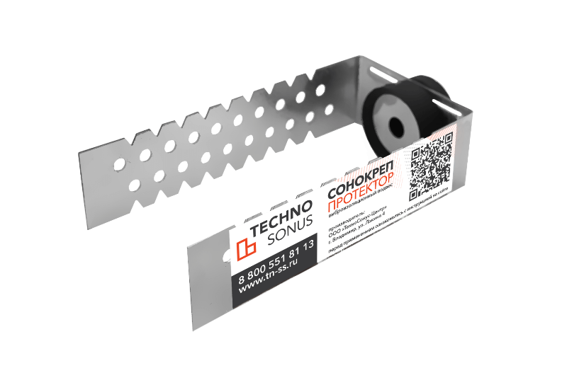 Сонокреп Протектор изготовлен из П-образной оцинкованной перфорированной стали толщиной 1мм и виброизолирующей вкладки исключающей контакт дюбеля с подвесом. Вкладка выполнена из резинового эластомера оптимальной плотности гарантирующего сокращение вибрации.