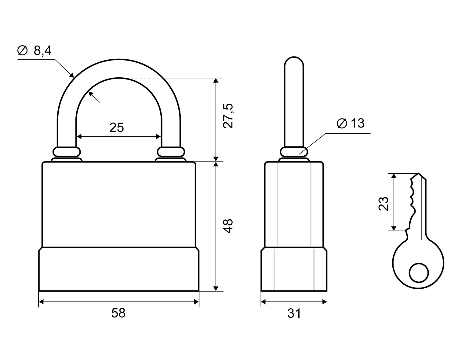 - Проем дужки 25 х 27,5 мм - взломостойкое отверстие (с учетом проушин) не позволяет удобно использовать для него ножовку или кусачки.