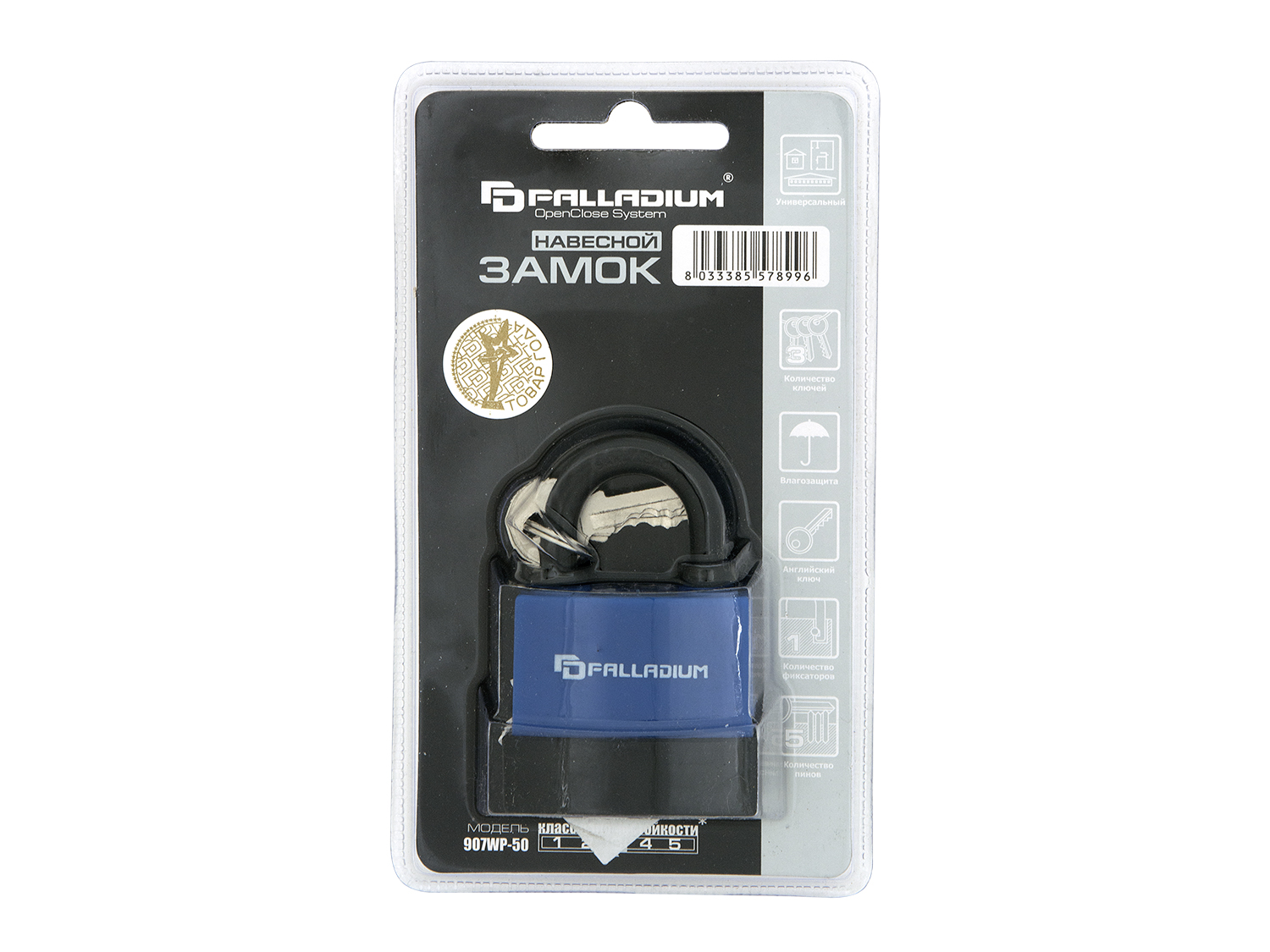 Навесной замок Палладиум 907WP-50 - это влагостойкий, ударопрочный замок среднего размера. Широкий спектр применения: изготовленный из чугуна и закаленной стали, он защищен от дождя, снега и грязи, но при этом не громоздок и может использоваться в гаражах и на велосипедных тросах.