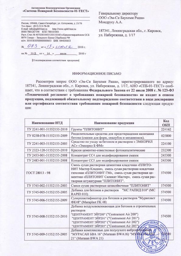 - Марка раствора по прочности при сжатии – не менее М100