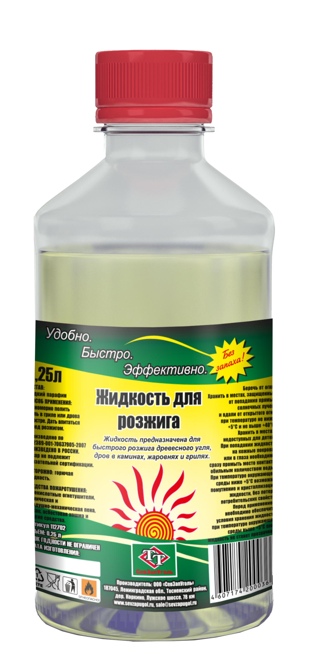 Жидкость сделана на основе парафина не создает копоти и посторонних запахов, подходит для приготовления углей для барбекю.