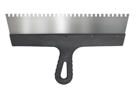 Предназначен для нанесения и распределения клеевых растворов и создания на их поверхности гребенчатой структуры при укладке керамической плитки, декоративного камня и др. Шпатель зубчатый служит для того, чтобы клеевая масса разравнивалась до одинаковой толщины слоя по всей площади материала без образования пустот.