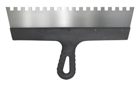 Предназначен для нанесения и распределения клеевых растворов и создания на их поверхности гребенчатой структуры при укладке керамической плитки, декоративного камня и др. Шпатель зубчатый служит для того, чтобы клеевая масса разравнивалась до одинаковой толщины слоя по всей площади материала без образования пустот.